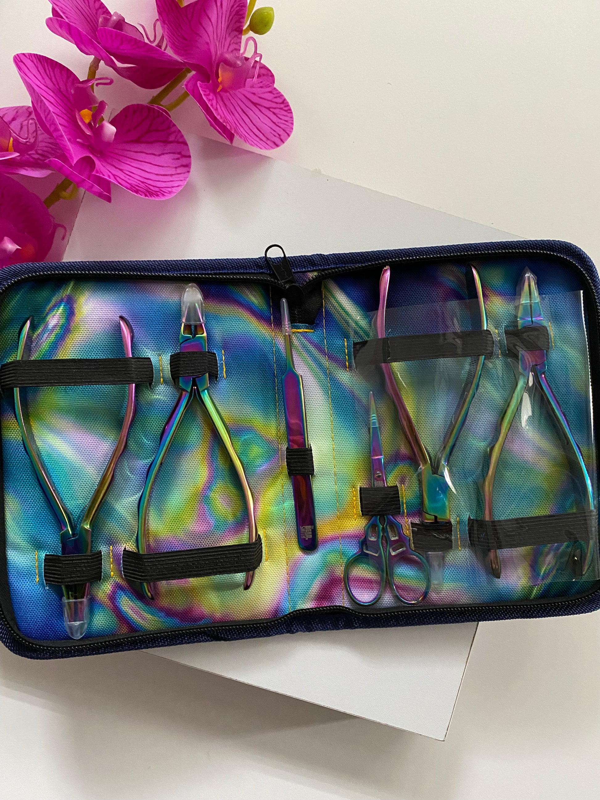 incluye pinza de corte, 2 pinza plana, pinza redonda, pinza para nudos y tijera.
